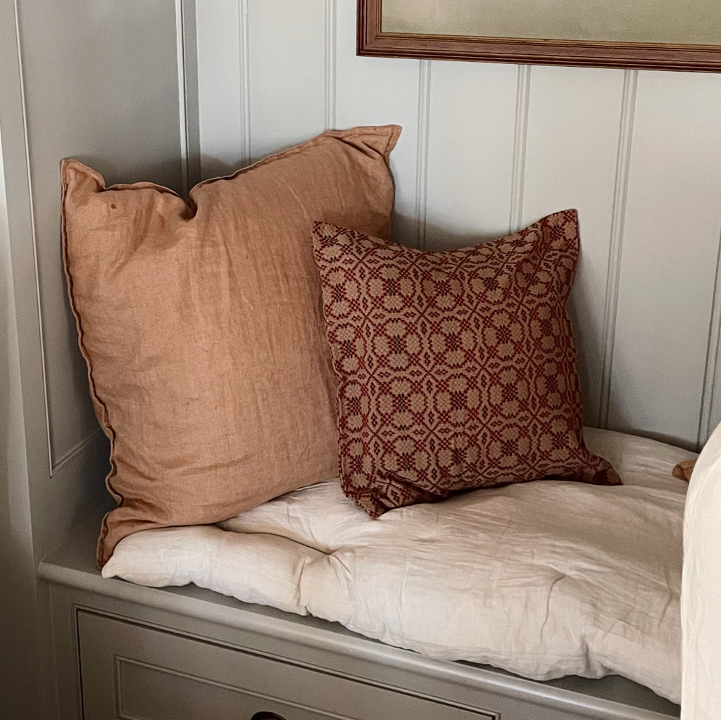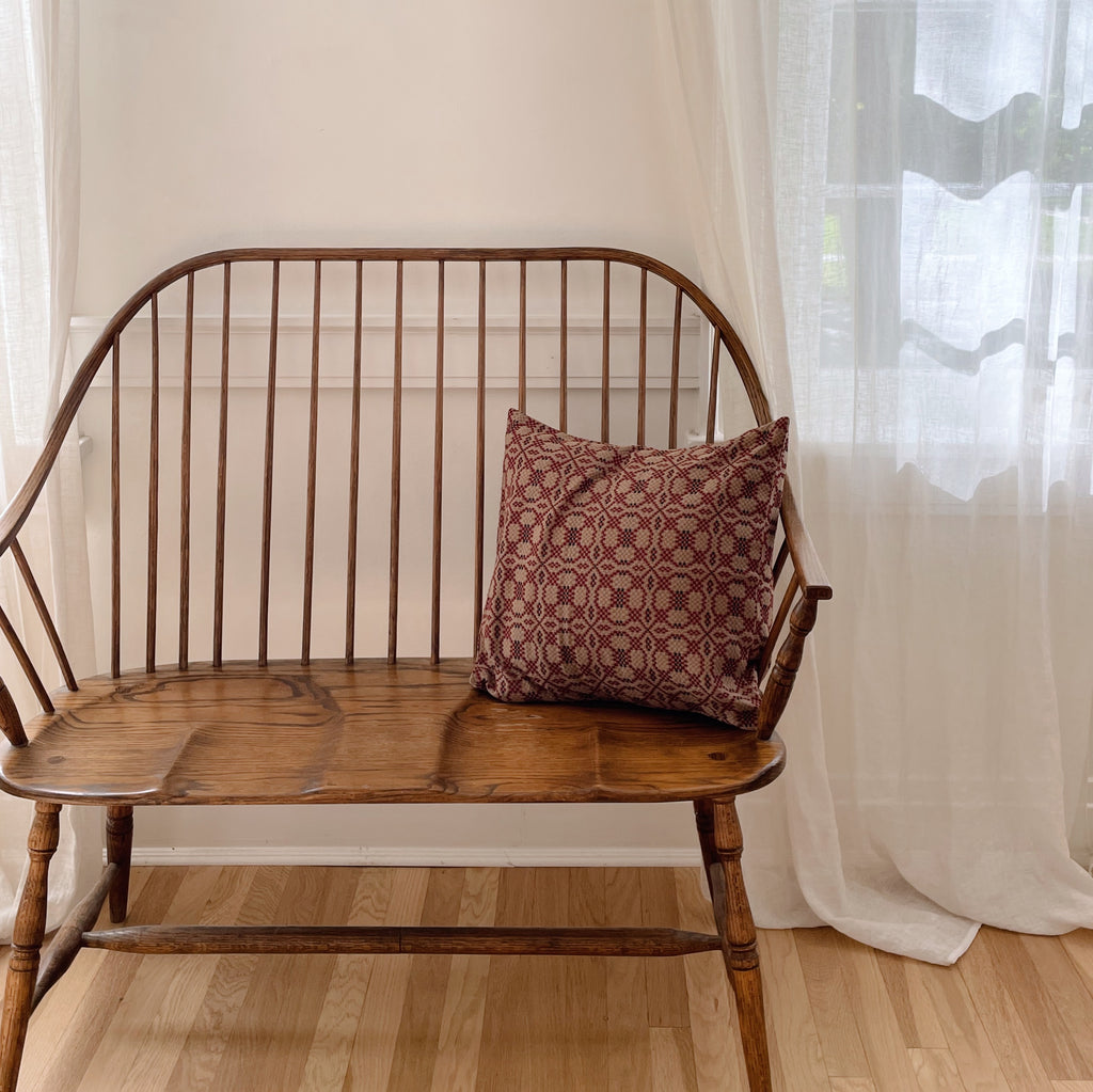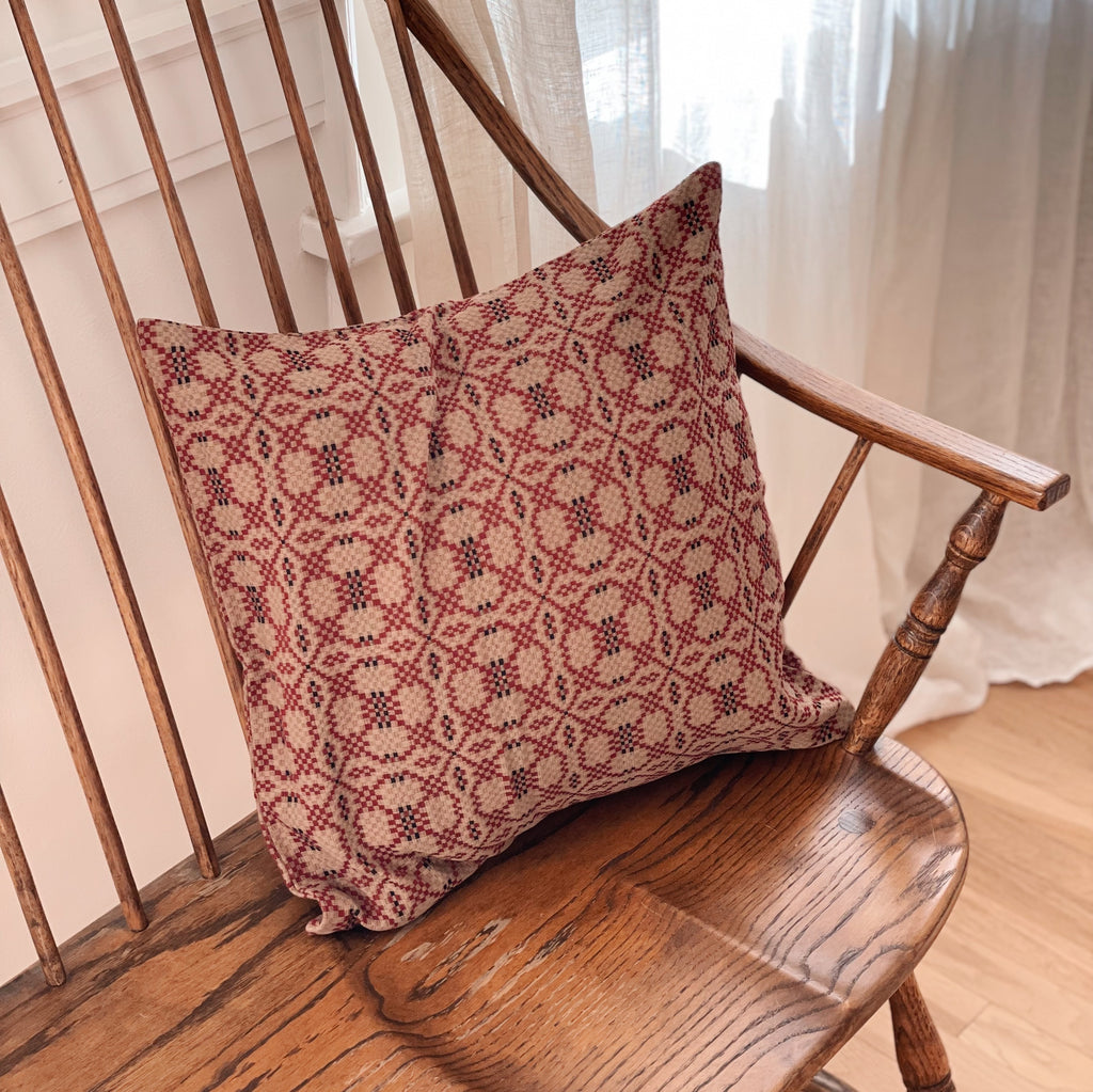 A beautifully woven jacquard pillow cover in a rich cranberry and soft cream palette The pattern has an heirloom feel inspired by traditional coverlets yet the piece is modern and fresh with crisp structure and clean finishing