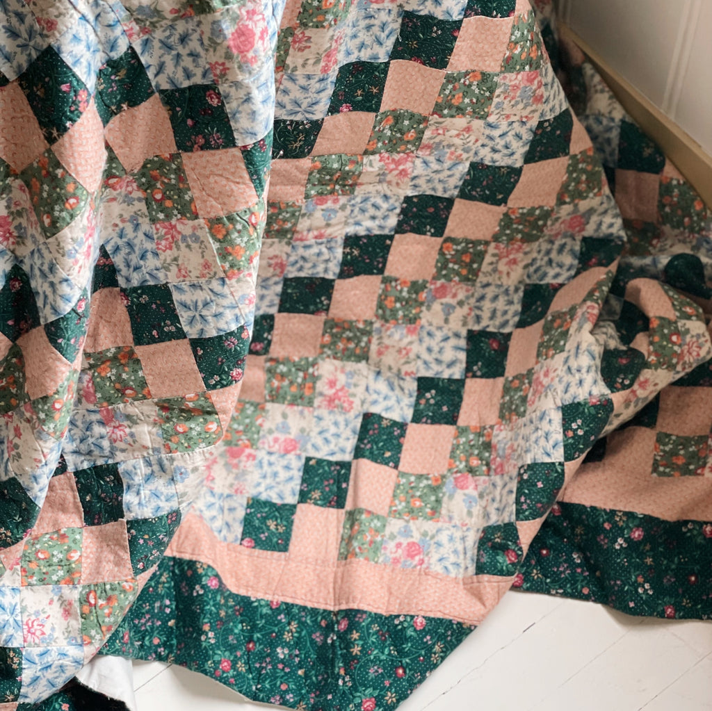 This gorgeous vintage hand-stitched quilt is a work of art, and the hours of artistry that went into its creation are impressive and inspiring. The beautiful "Trip Around the World” patterning is pure joy, with beautiful squares of detail and color.
