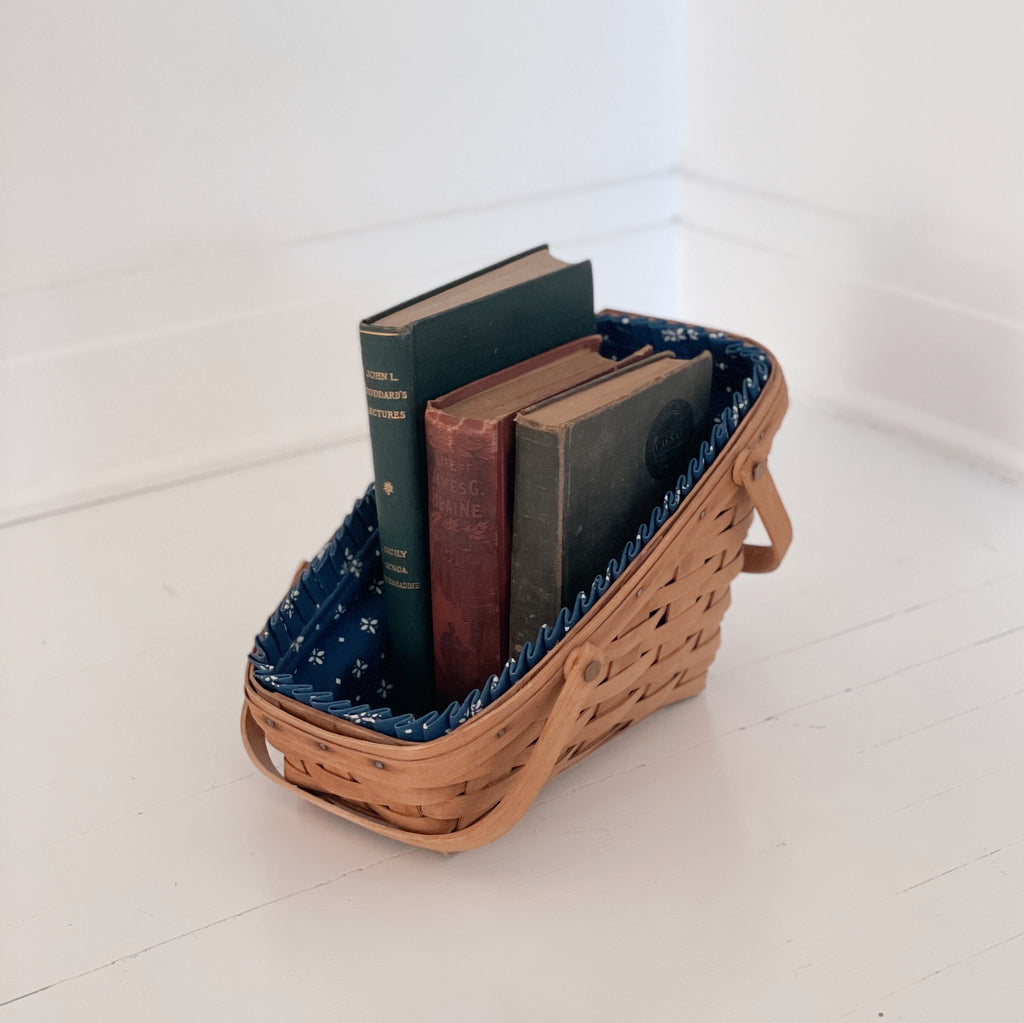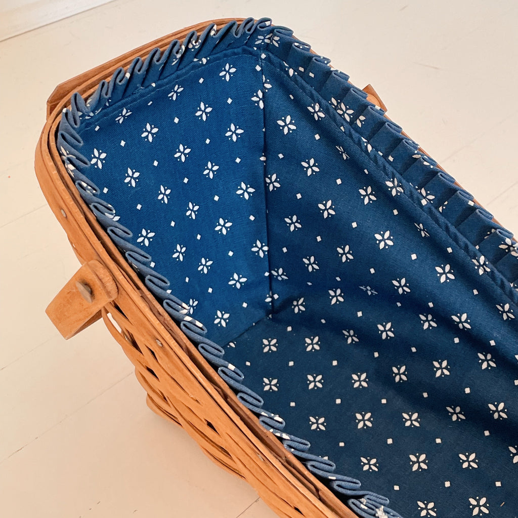 Inside, a navy calico liner with tiny white flowers adds that beloved nostalgic touch, so reminiscent of prairie dresses, winter quilting bees, and old farmhouse cupboards. It feels especially right for the holiday season, filled with evergreen sprigs, ribbons, or little gifts waiting to be chosen. Made in USA.