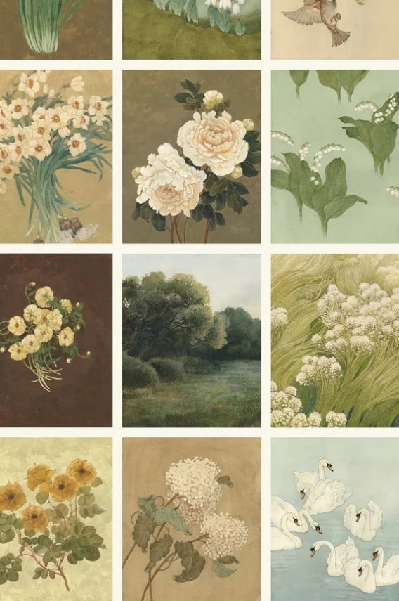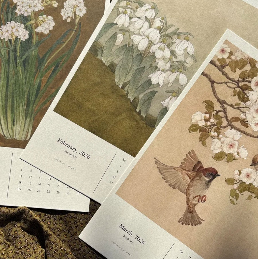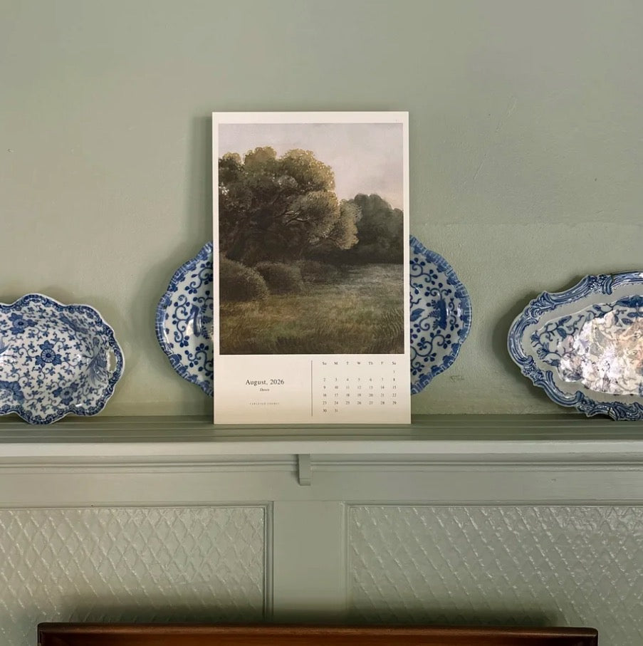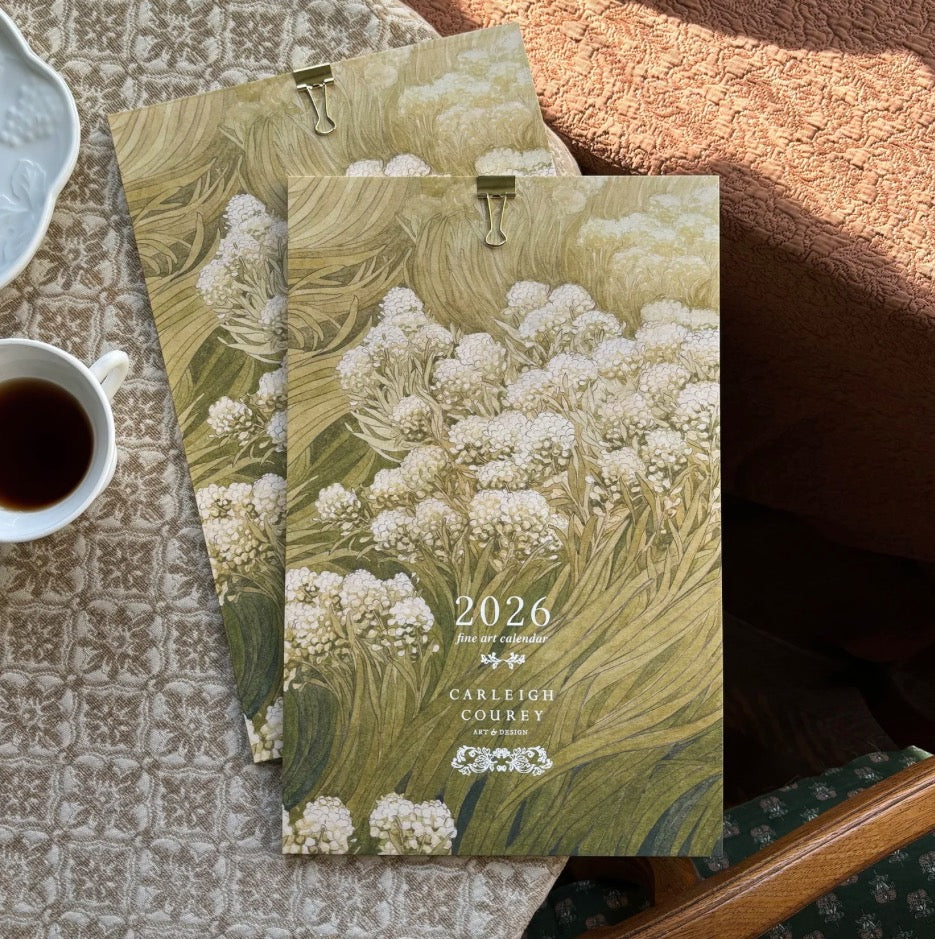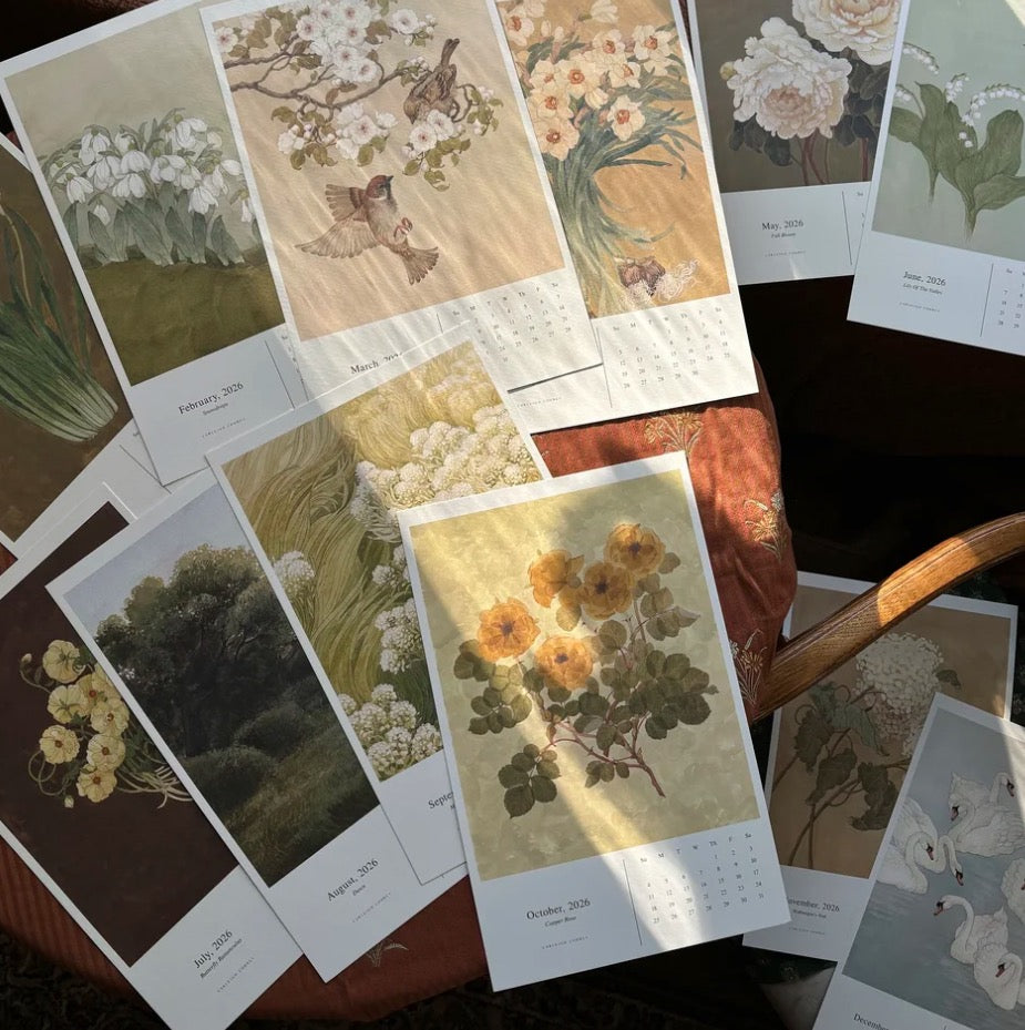 The Fine Art Wall Calendar features prints of twelve original paintings that can be cut out and framed after each month has passed. Printed on a smooth, heavy, natural white paper, and bound by a small removable brass clip.