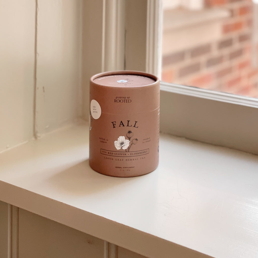 Fall Tea Ingredients: Trifolium pratense (red clover)*, rosa rubiginosa (rose petals)*, cyclopia (honeybush)*, Sambucus nigra (elderberries)*, taraxacum (dandelion root)*, Ocimum tenuiflorum (tulsi)*, glycyrrhiza glabra (licorice root)* * organic ingredients