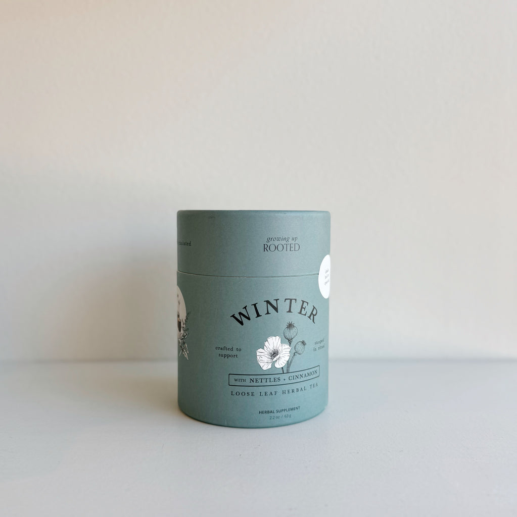 Winter Tea Ingredients: Mentha spicata (spearmint), Urtica dioica (nettles), Clitoria ternatea (butterfly pea flower), Ocimum tenuiflorum (tulsi), Cinnamomum verum (sweet cinnamon), Rosa canina (rose hips), Glycyrrhiza glabra (licorice)* (*organic ingredients)
