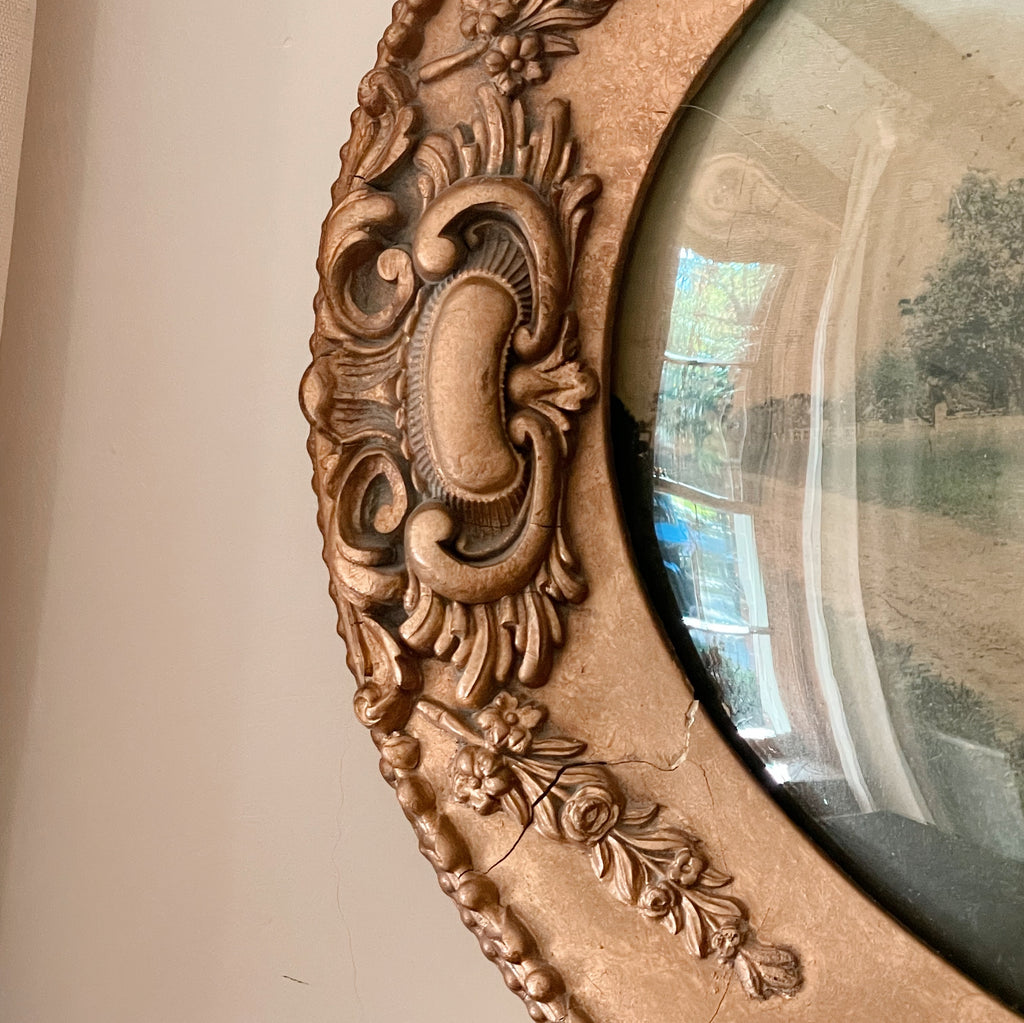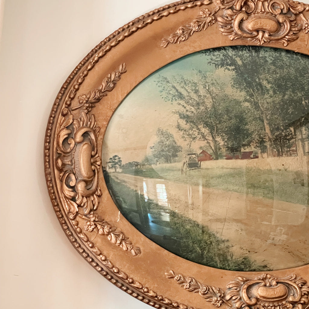 A stunning turn-of-the-century oval portrait frame with its original convex glass and ornate gilded detailing, now preserving a soft countryside print. The scene, a quiet rural lane lined with trees and a tucked-away homestead, feels like stepping into a sepia-washed memory, gentle and serene.