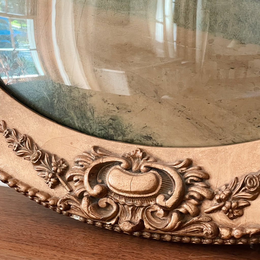 Pieces like this bring so much old-world soul: the curved glass, the scrolling flourishes, the mellow gold patina earned over a century of hanging in warm, sunlit rooms. Hang it over a dresser or mantel, or nestle it into a gallery wall for depth, charm, and a whisper of history. An heirloom piece that turns any corner into a poetry-filled moment.