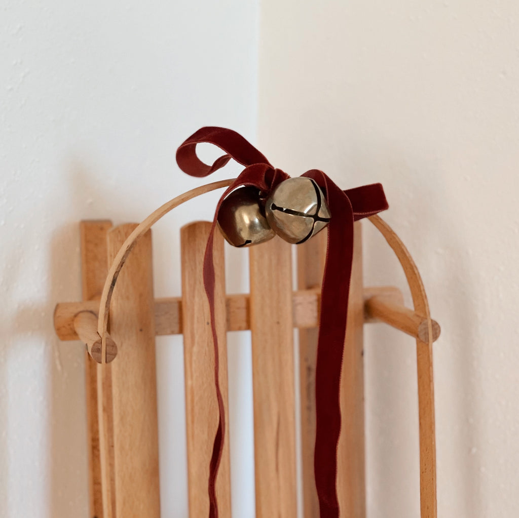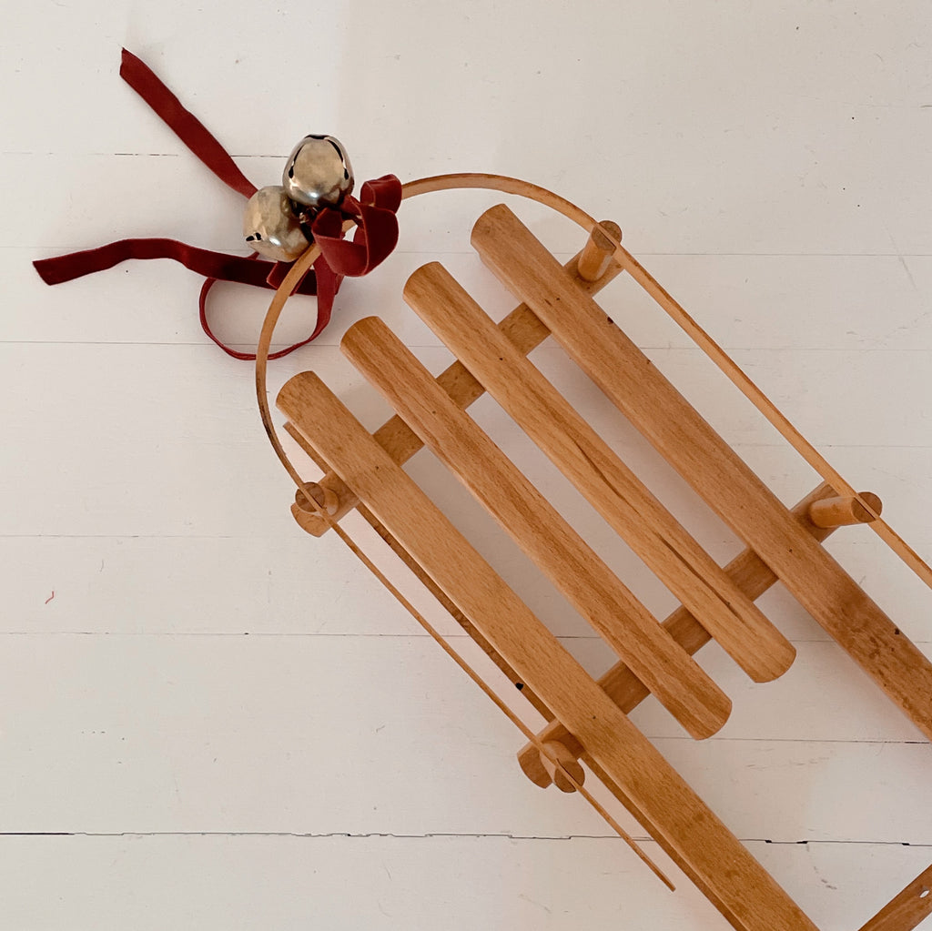 A charming wooden mini sled made in warm honey-toned wood, complete with a velvet pull ribbon and tiny brass bells. This piece brings old-fashioned winter magic to any room. Style it beside a Christmas tree with miniature gifts, on a mantel with clipped greens, or on a tabletop with pinecones and berries. Its curved runners and simple spindle seat give it a timeless, handmade feel.