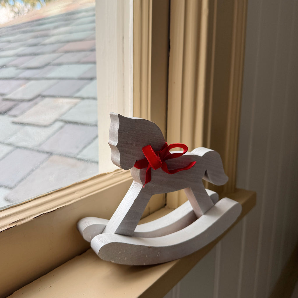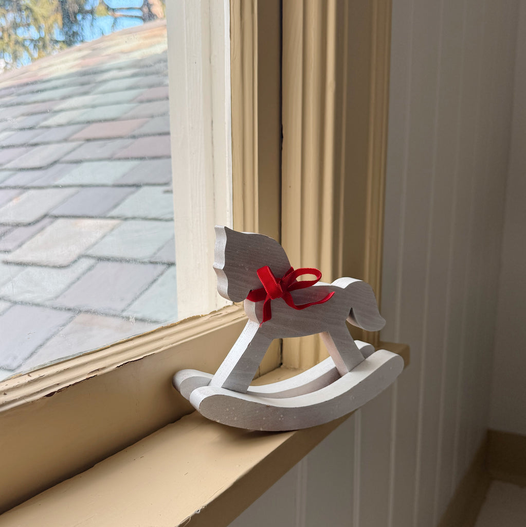 A tiny hand-carved wooden rocking horse, painted a soft winter white and tied with a simple red ribbon bow, just the right touch of old-fashioned Christmas charm. This petite piece feels like something plucked from a windowsill or tucked beneath the boughs of a nostalgic holiday tree.
