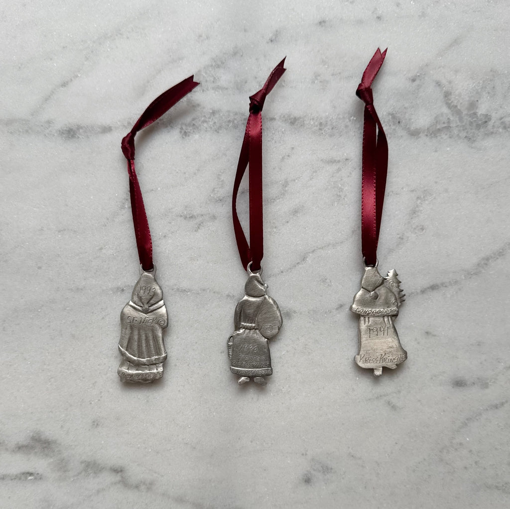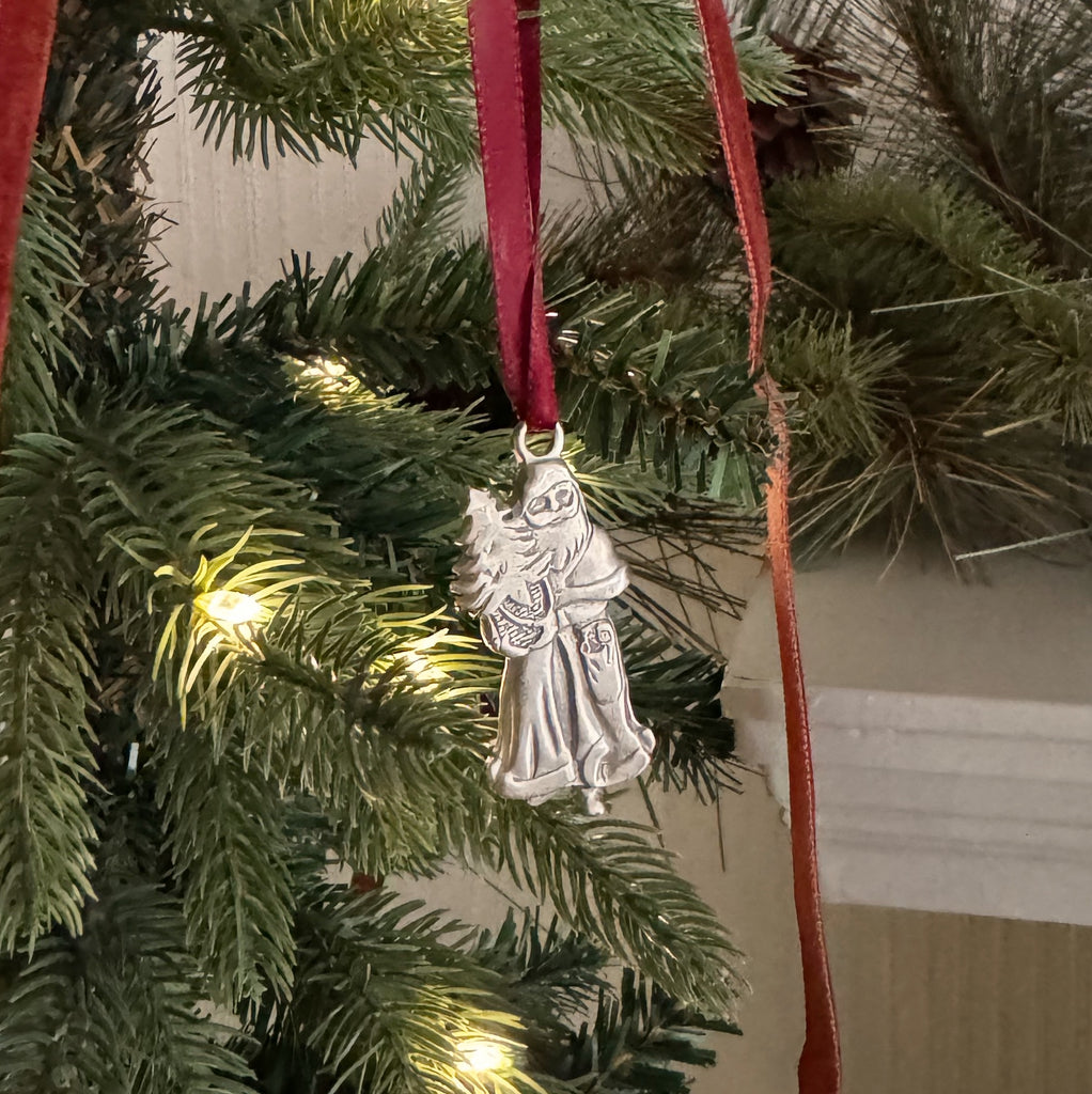 Bring classic elegance to your holiday season with these vintage pewter Santa ornaments! They are perfect for decorating your Christmas tree and more. These nostalgic treasures can be tied to stockings, added as a unique gift topper, or tucked into napkins for a sophisticated table setting. Each ornament carries a piece of history, filling your home with warmth, new memories, and festive charm. Made in USA.