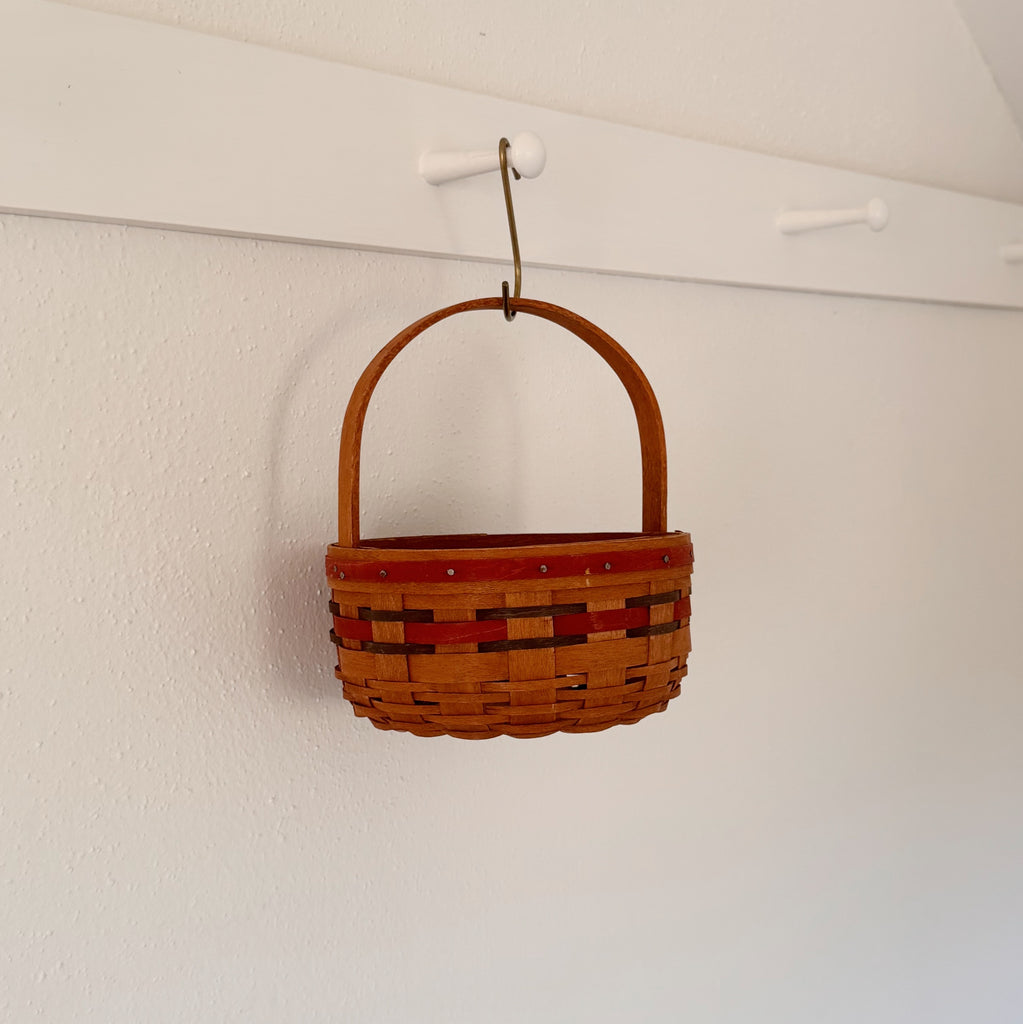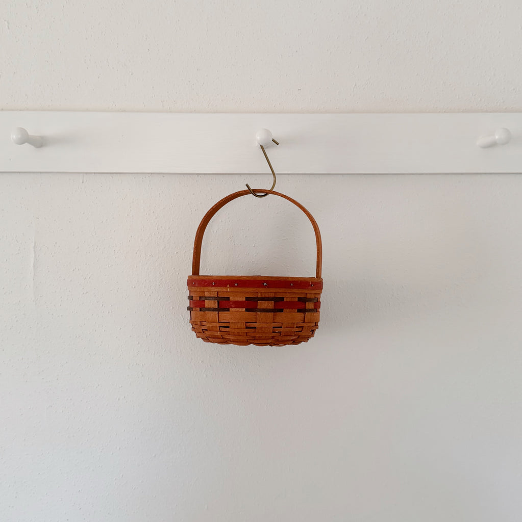 A sweet, hand-woven berry basket with a cheerful red rim, like something plucked from a storybook picnic scene or nestled beside Santa’s boots on Christmas Eve. Its petite size makes it perfect for little hands or for styling on a peg rail, filled with greens, candies, or tiny pinecones. This piece has been signed by its maker.