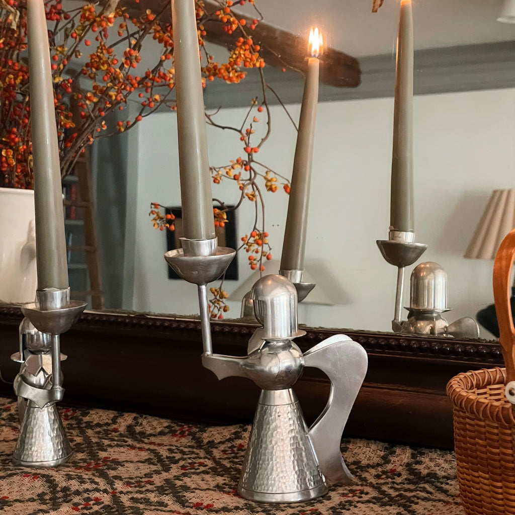 Gorgeous mid-century handmade hammered metal angels, each holding a taper candle aloft as if offering light into the winter night. Sculptural and serene, with a beautiful pewter-like finish and softly gleaming wings, they feel both sacred and modern, the kind of Christmas décor that doesn’t shout, but glows.