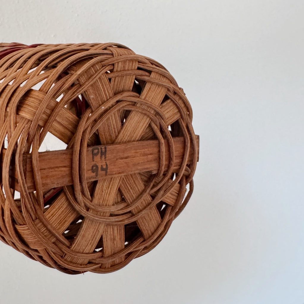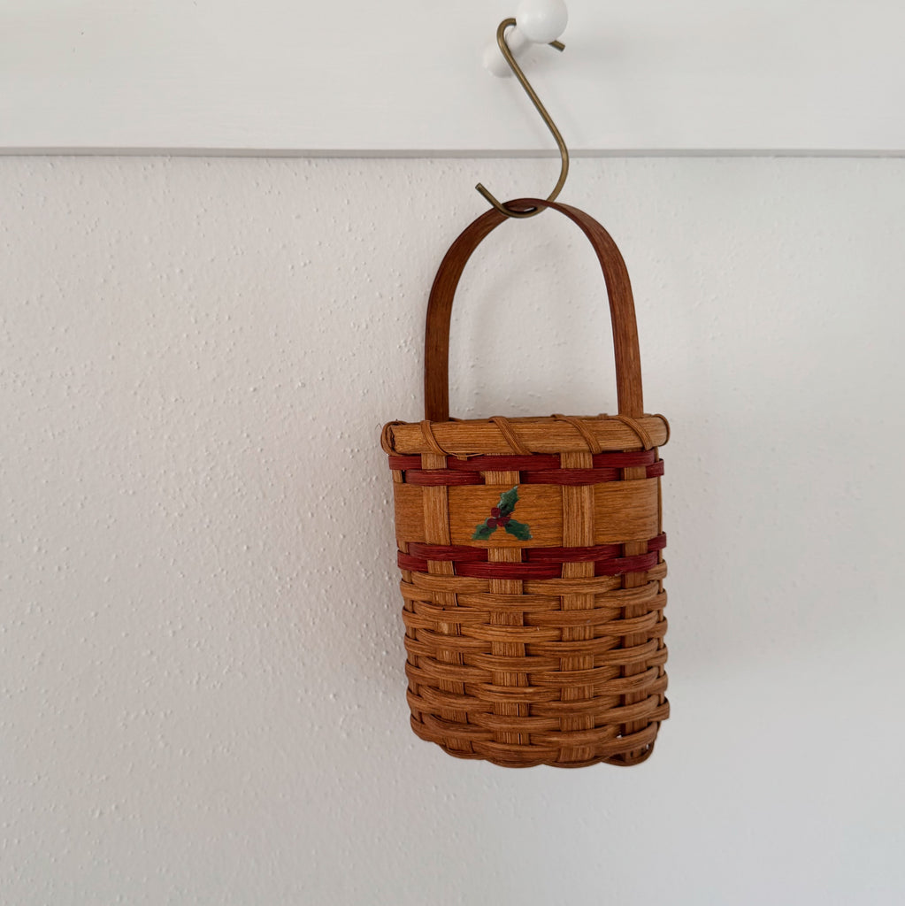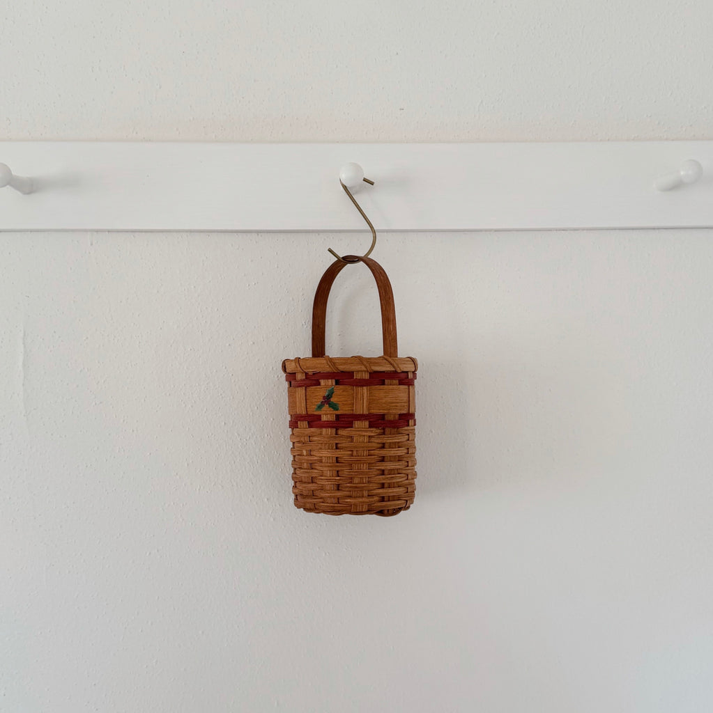 A sweet, hand-woven berry basket with painted cheerful holly, like something plucked from a storybook picnic scene or nestled beside Santa’s boots on Christmas Eve. Its petite size makes it perfect for little hands or for styling on a peg rail, filled with greens, candies, or tiny pinecones. This piece has been signed by its maker.