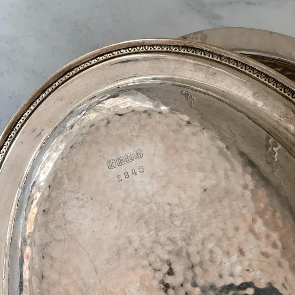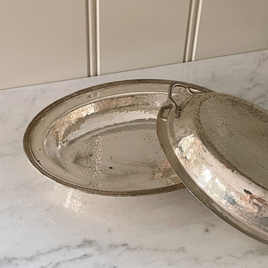 Add this amazing silver-plated serving dish to your celebratory spreads for that extra touch of elevation and care. A beautiful hammered double-handled dish with beautiful detailing, the lid helps to retain heat, and adds a flourish for the reveal.