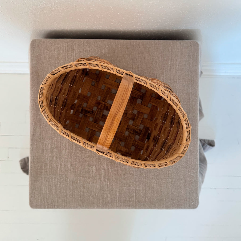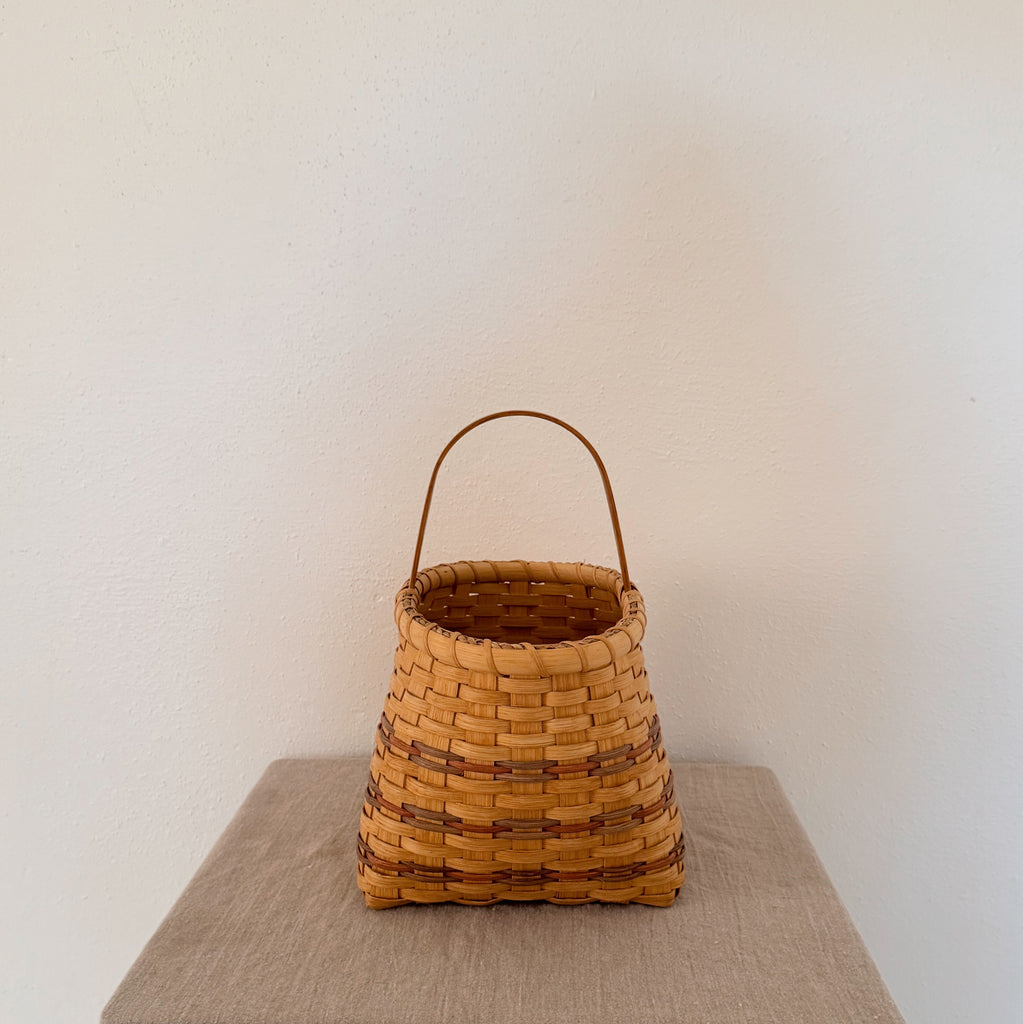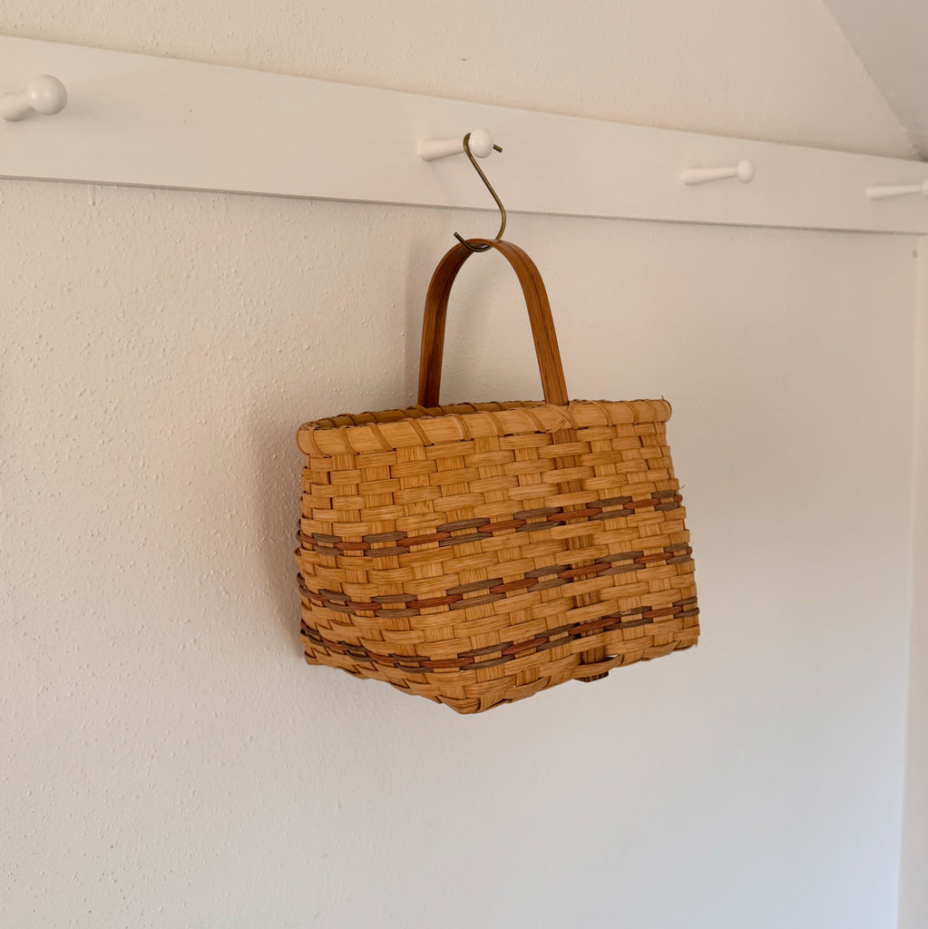 Its warm golden reed, accented with soft woody tones, gives it that quiet, New England farmhouse charm...useful, humble, and beautiful without trying. The scale makes it incredibly versatile: a little market tote, a foraging basket, a spot to store sewing supplies or children’s library books, or simply a pretty piece to hang on a peg rail.