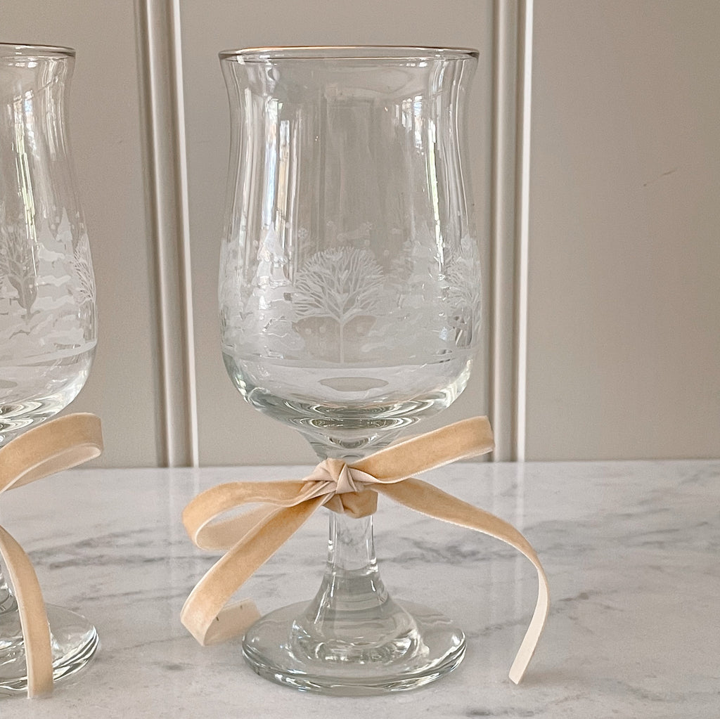 Frost-light seems to linger in every line, as though the glass asks you to remember the whisper of falling snow. At its stem rests an ivory velvet bow, tied with tender care which is an elegant touch of warmth against the season’s chill, completing the piece like a final note in a winter hymn. Ribbon included.