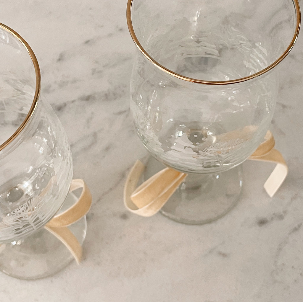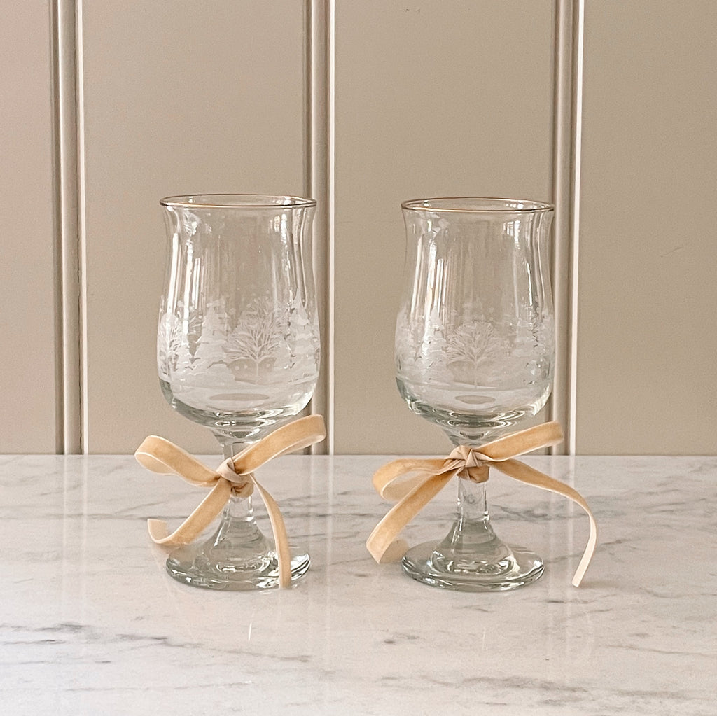 Gold-rimmed wineglasses stand like a quiet keepsake of winter, their delicate bowls etched with the soft hush of snowy pines and the slender silhouettes of bare-branch trees.