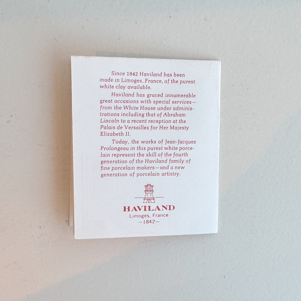 From Haviland, made in Limoges, France. Founded in 1842, Haviland has always used only the purest white clay for their porcelain. Designed by Jean-Jacques Prolongeau, a gifted disciple of Raoul Dufy and one of the rare ceramists celebrated on the world stage. His works represent the skill of the fourth generation of the Haviland family of fine porcelain makers.