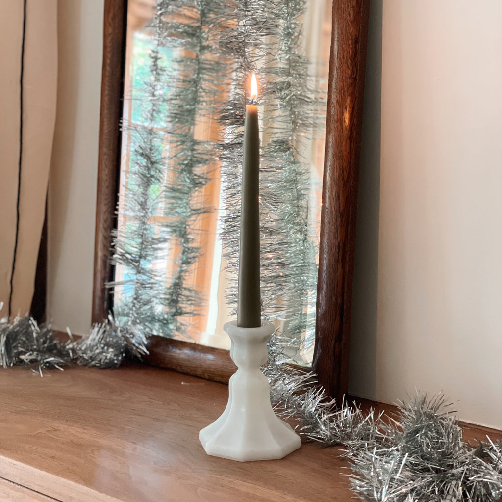 Perfect for the winter season, this milk glass candleholder with make a lovely addition to your mantle or table. Add a warm glow with our colorful hand-dipped taper candles