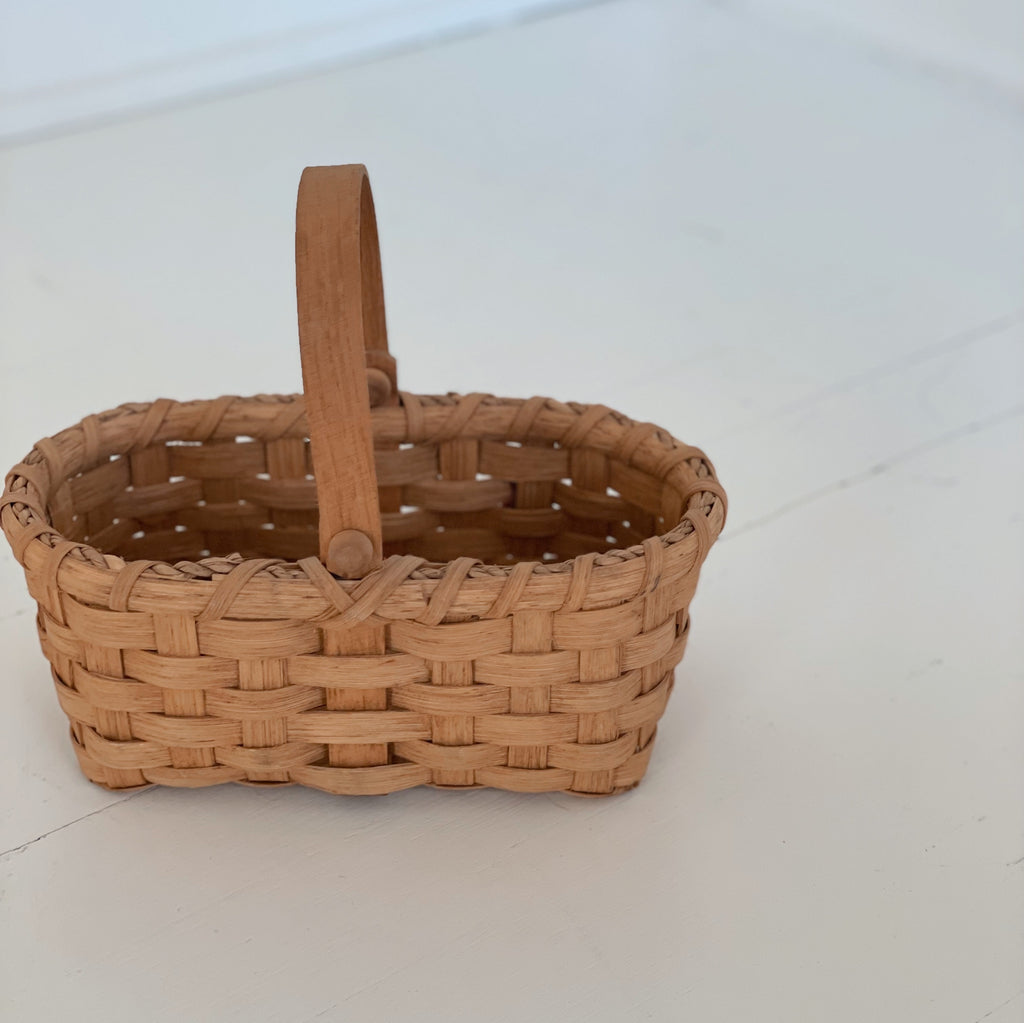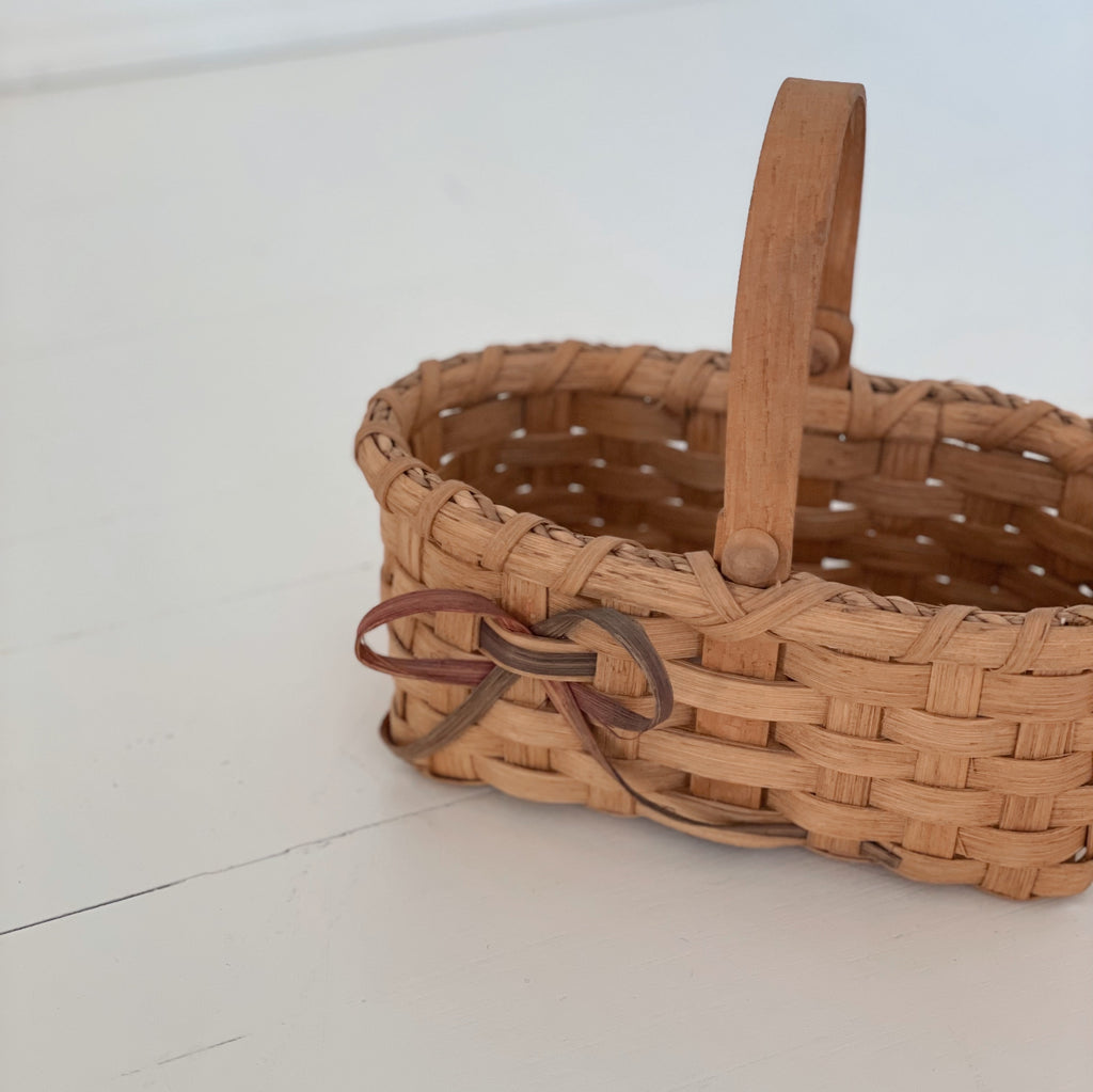 A darling little hand-woven basket, sized just right for tiny treasures. Warm honey-toned reeds and a petite handle give it that nostalgic, New-England-attic-find charm and the small woven bow on the front adds the most tender touch. This sweet piece has been signed by its lovely maker.