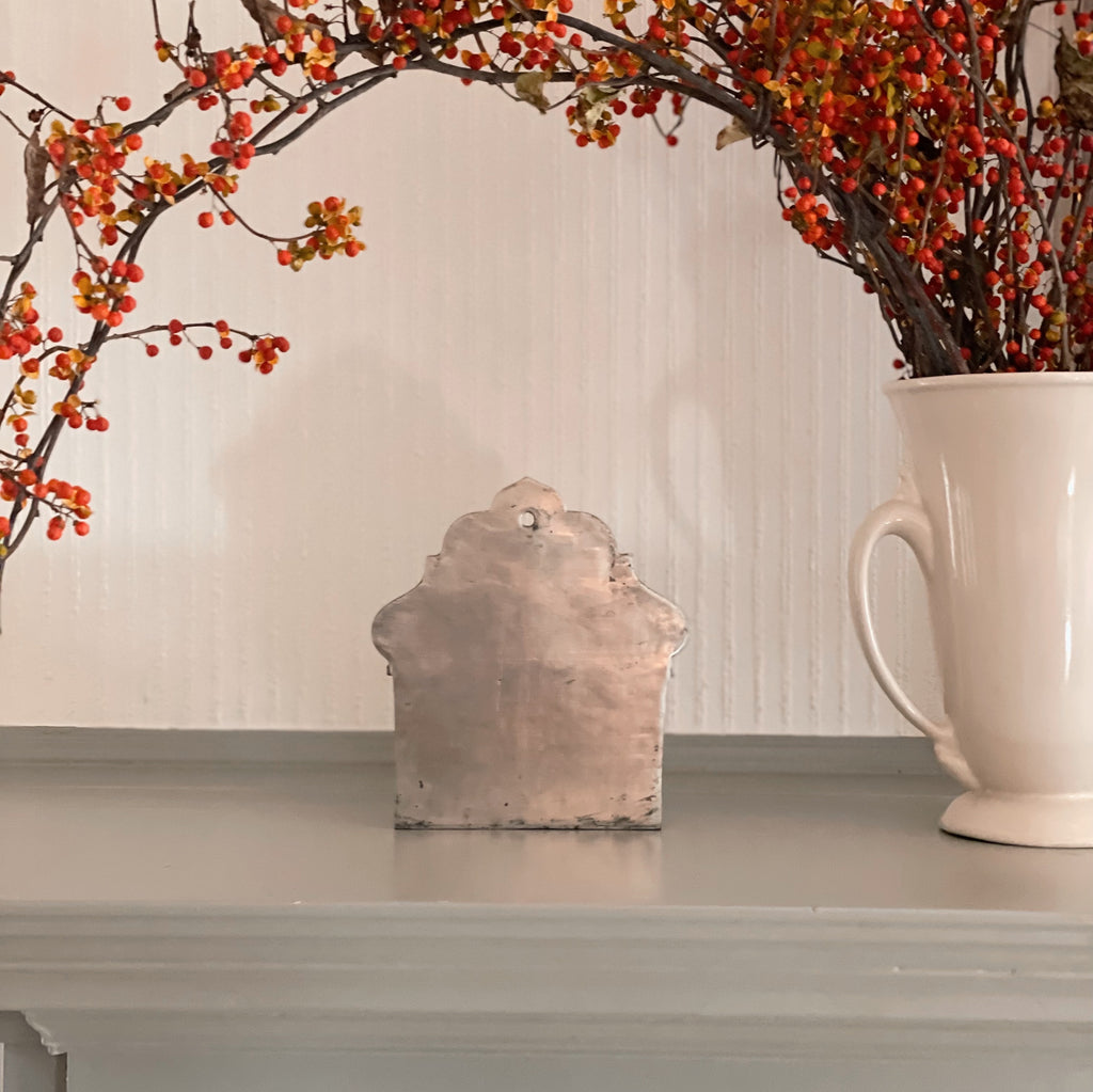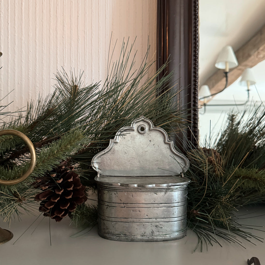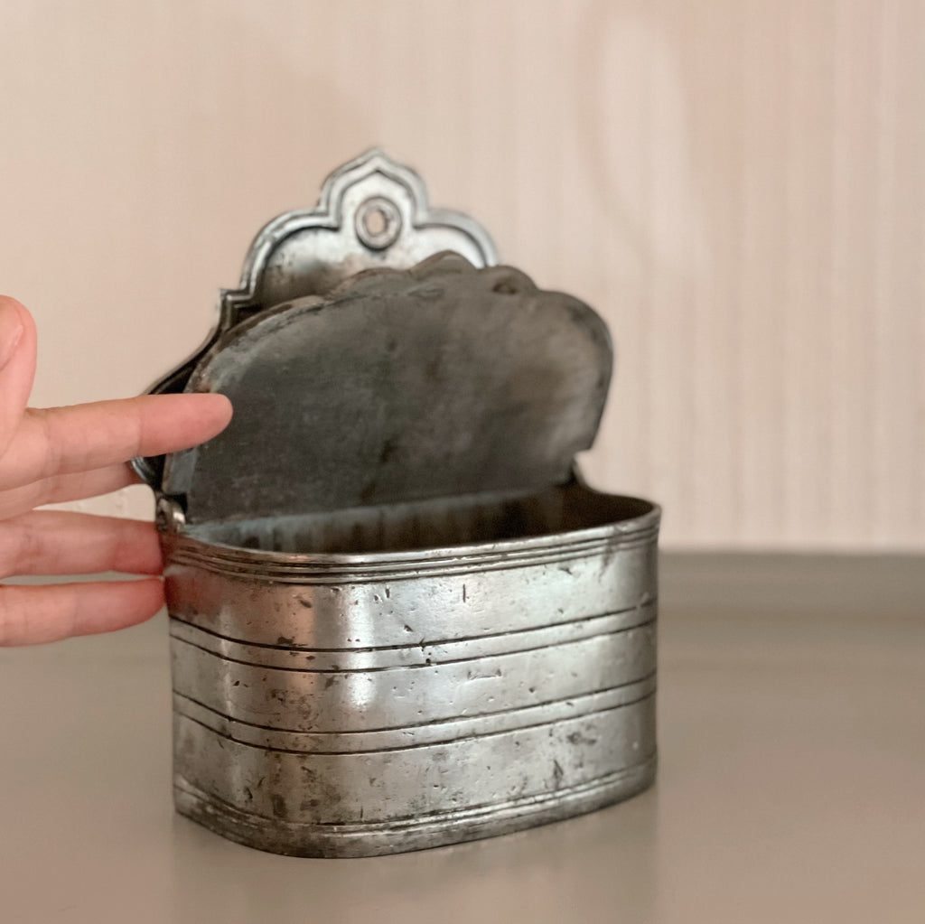 A beautiful pewter wall hanging match box with a soft, timeworn patina and gentle curves that speak to simple utility and old world charm. The scalloped backplate, hinged lid, and weight of the metal feel like something found in a quiet European farmhouse, made to hold matches beside the hearth or stove.