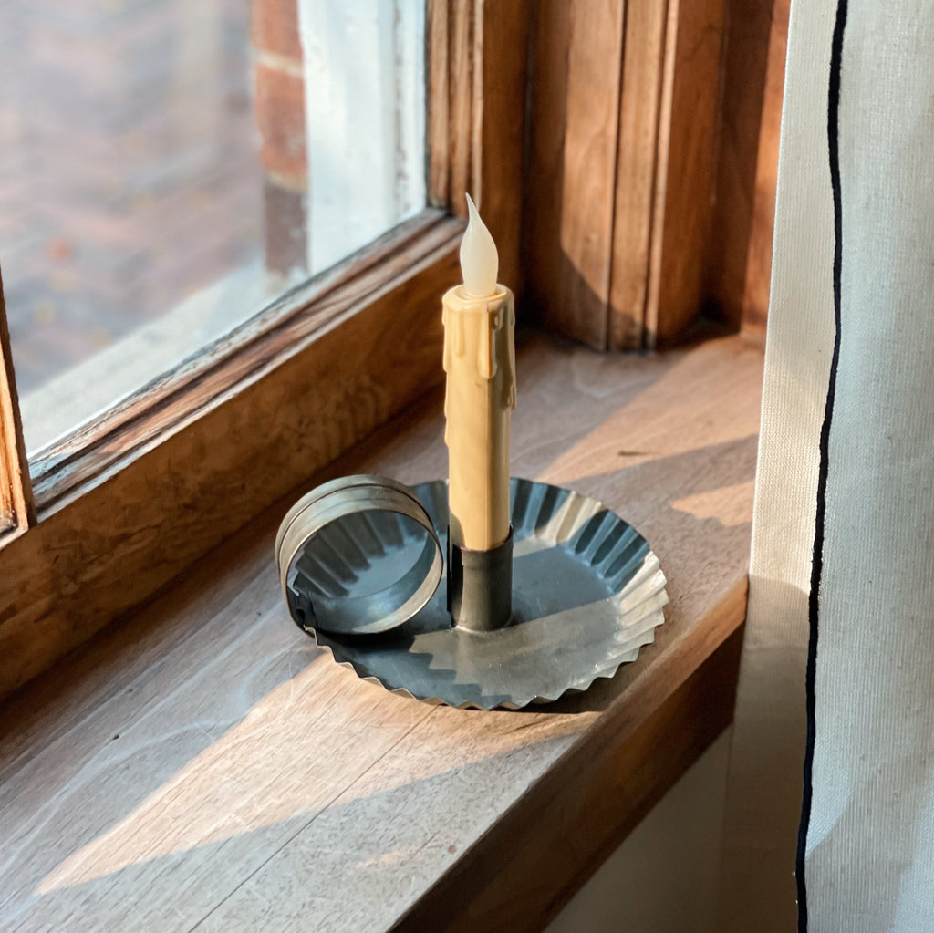 This little candlestick feels like it stepped out of an old storybook. A simple metal chamber base with a curled handle and a warm flickering taper that brings gentle light to a room without fuss. Set it on a bedside table, a kitchen counter, or atop a stack of books and let it glow softly in the evening.