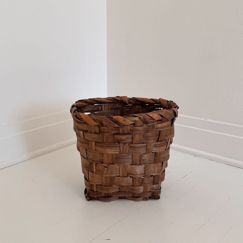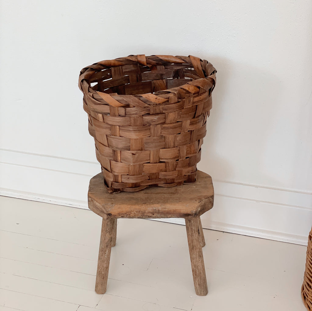 A vintage handwoven basket, this piece is as beautiful as it is useful. Perfect as a waste basket for smaller spaces like the bathroom or laundry room, we also love these sturdy baskets for small toy bins in the playroom. This basket could also be perfect for keeping kindling or small logs at the ready next to the fireplace!
