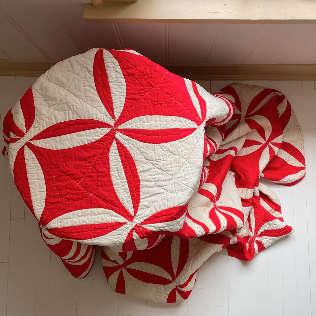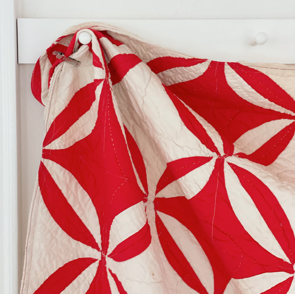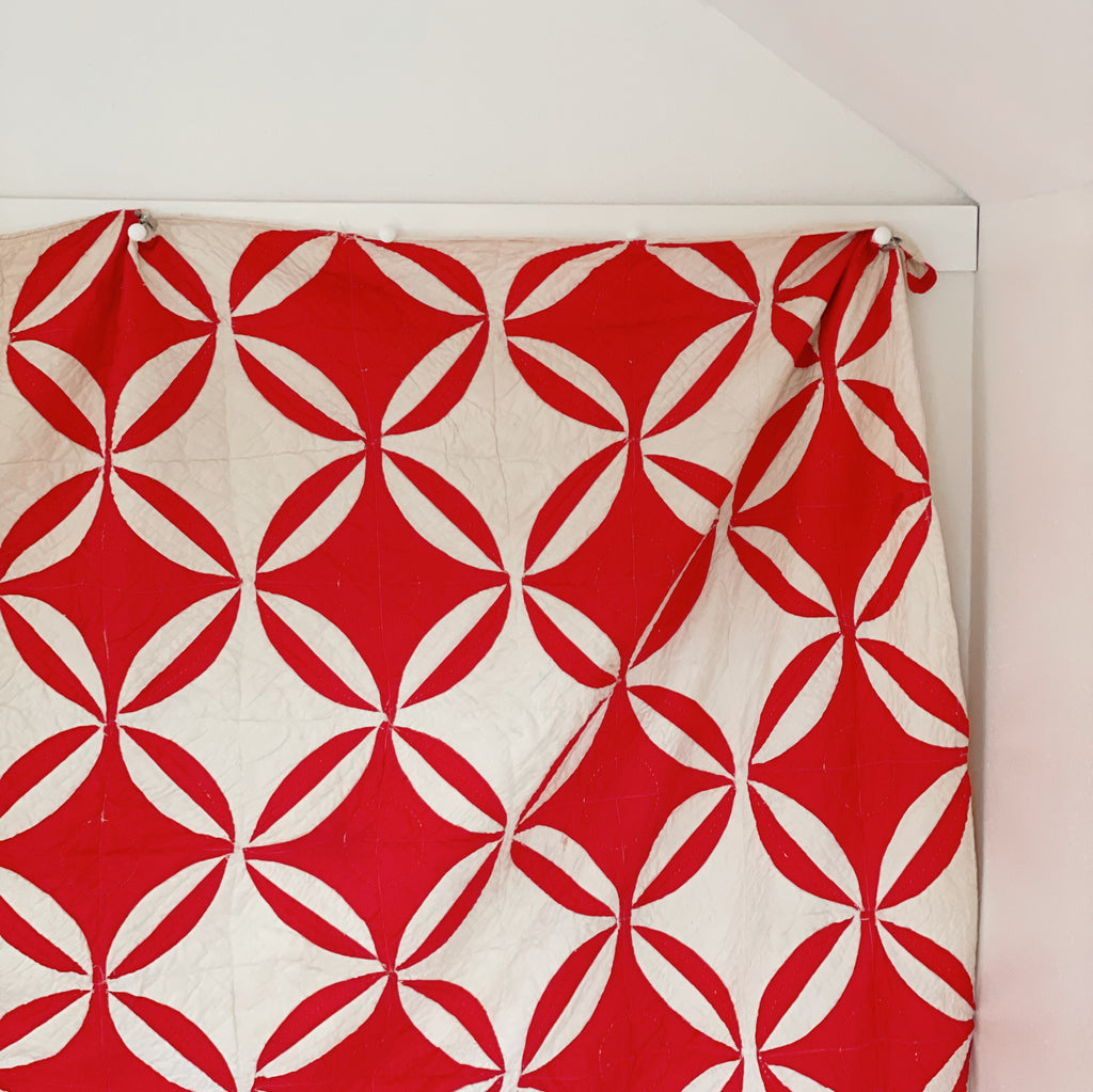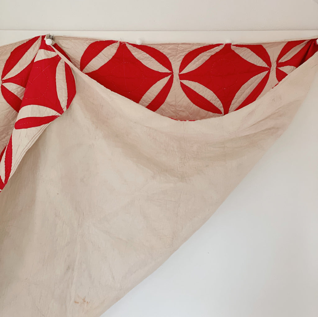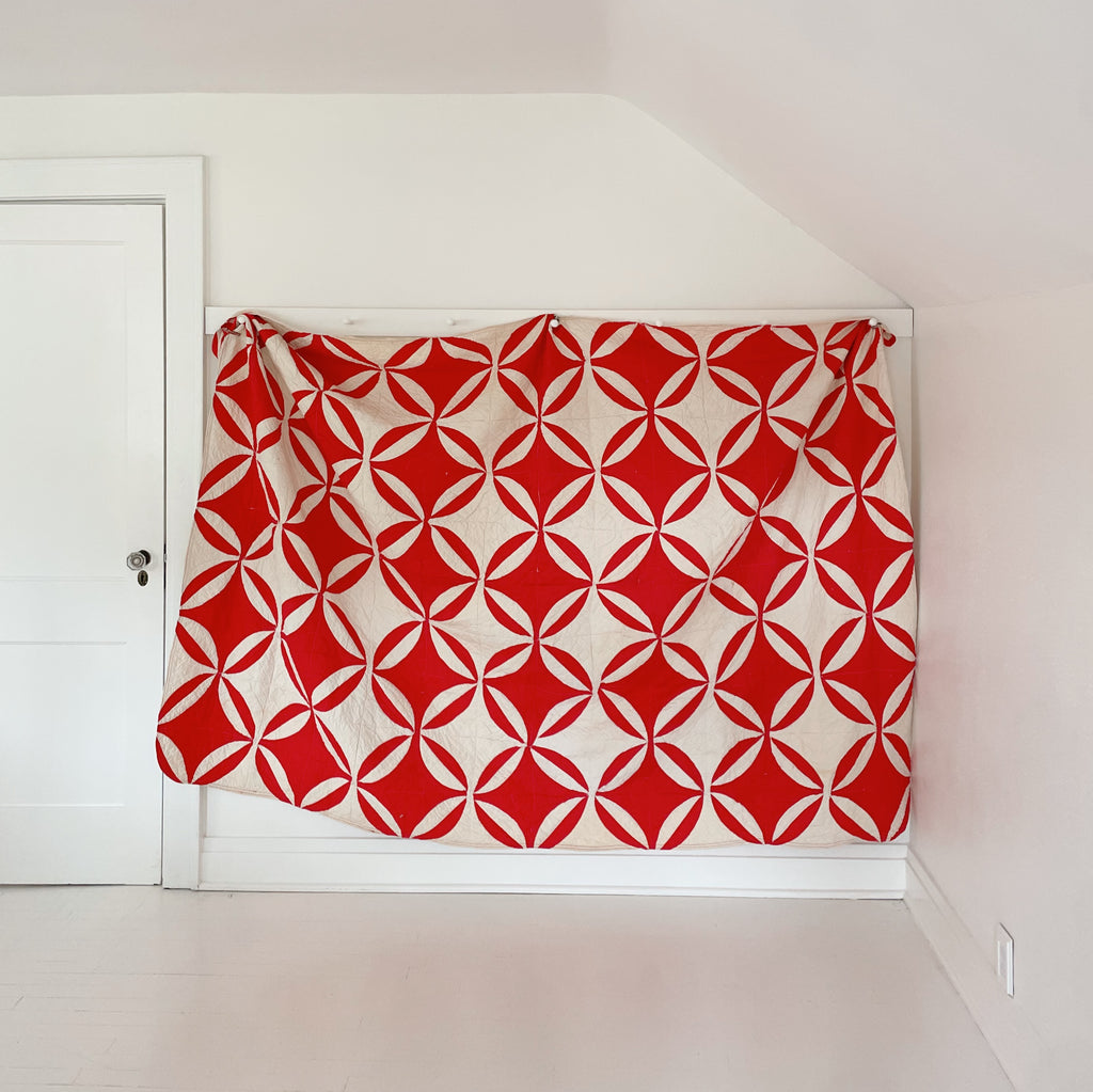 This antique variation, stitched in jubilant red and winter white, carries the spirit of old-world holiday linens and heirloom church banners. Curved seams meet with quiet precision, forming interlocking rings that feel like wreaths, snow petals, and Christmas ribbons in motion. It’s bold yet tender...geometric, but softened by hand quilting and time.