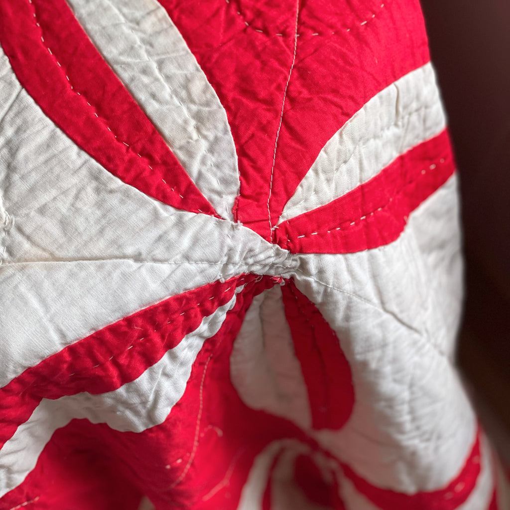 Once considered a mark of skill, this pattern asked its maker to move slowly, to coax gentle curves, to be exacting without losing warmth. Red-and-white quilts like this one were often saved for the most special moments: winter parlors dressed for guests, Christmas beds turned down with care, treasured family gatherings where memory lived in fabric.