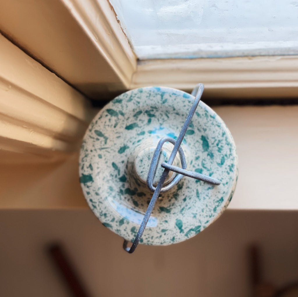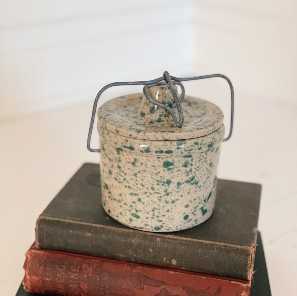 A darling little piece of early kitchen history, this vintage graniteware lunch pail, finished in a soft cream with green speckle, still wears its original metal handle and latching top. Just the sort of thing a farmhand or schoolchild might have carried generations ago, and now a perfect accent for open shelving, a winter pantry vignette, or tucked near your baking corner with tiny utensils or spices inside.