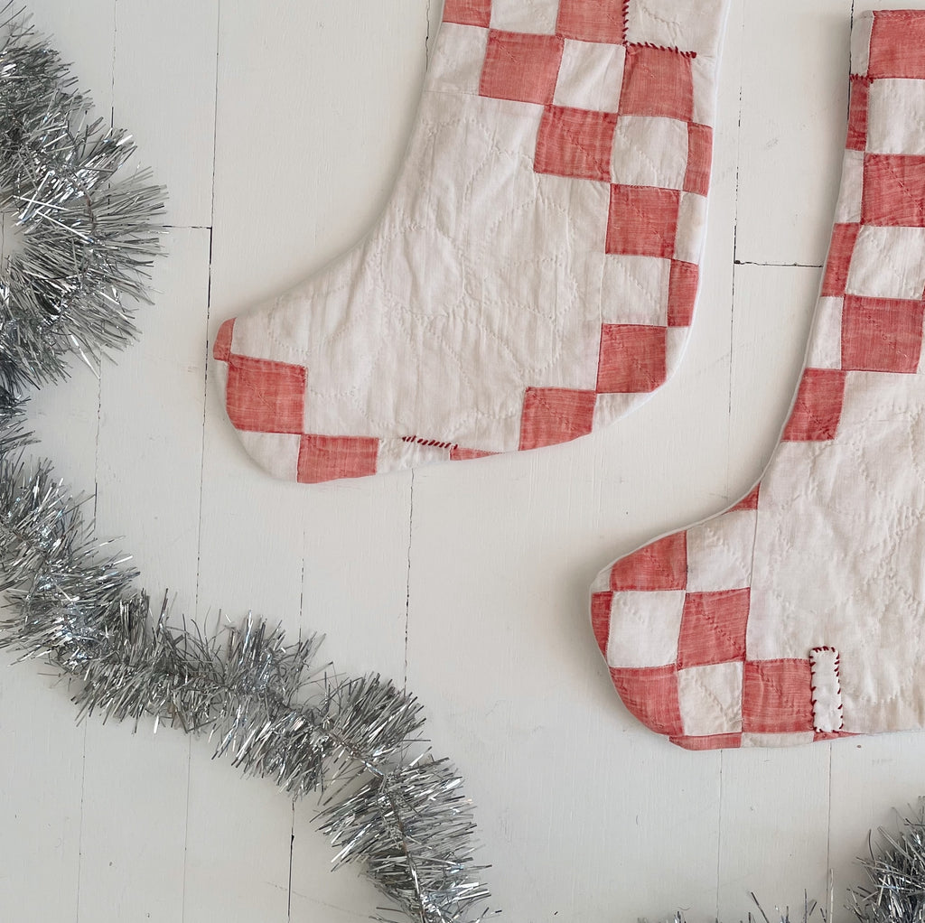 Made in house by our sewist from a stunning old red and white Irish chain quilt that had some tattering on the edges. These heirloom quality stockings are one of a kind, and have been visibly mended to add both function and beauty to worn spots. The backs of each stocking are organic white linen, and each comes with a loop to hang. Sold individually.